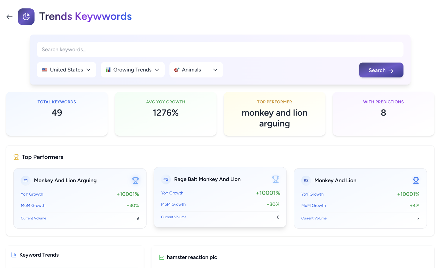 It provides a historical graph to show you the seasonality of a keyword and also offers a “predictive trends” feature to help you anticipate what’s coming next.