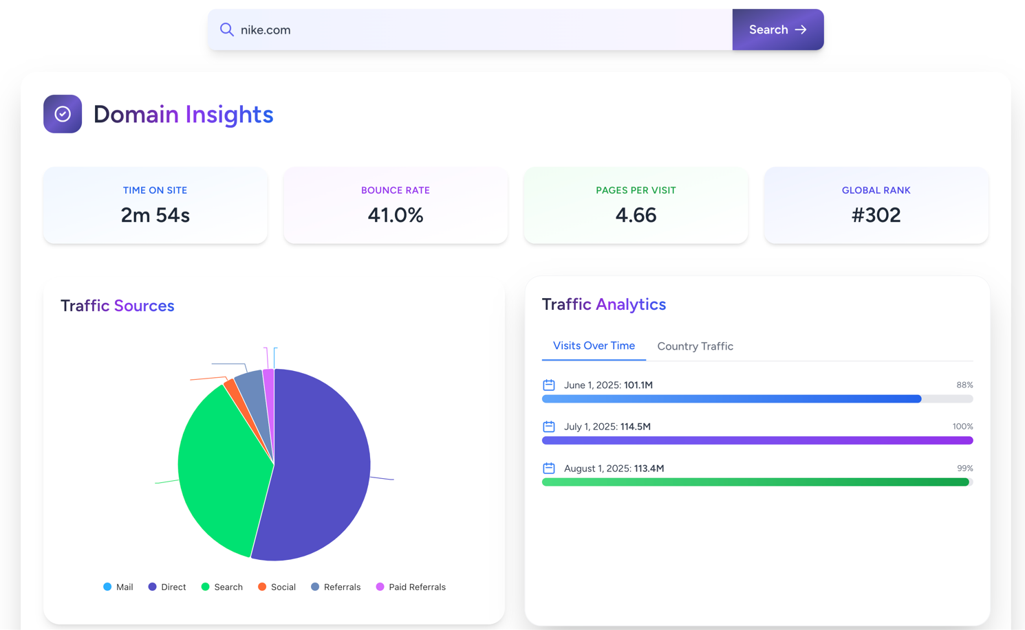This Domain explore provides a comprehensive look at a website’s SEO and paid search performance. It displays key metrics like Organic Keywords, Paid Keywords, and estimated monthly traffic from both sources, along with the Google Ads Budget.