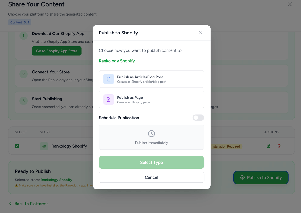 One-Click Share: Easily connect your WordPress or Shopify account to publish your article directly as a blog post/article or a page. Simply enter your platform credentials once.