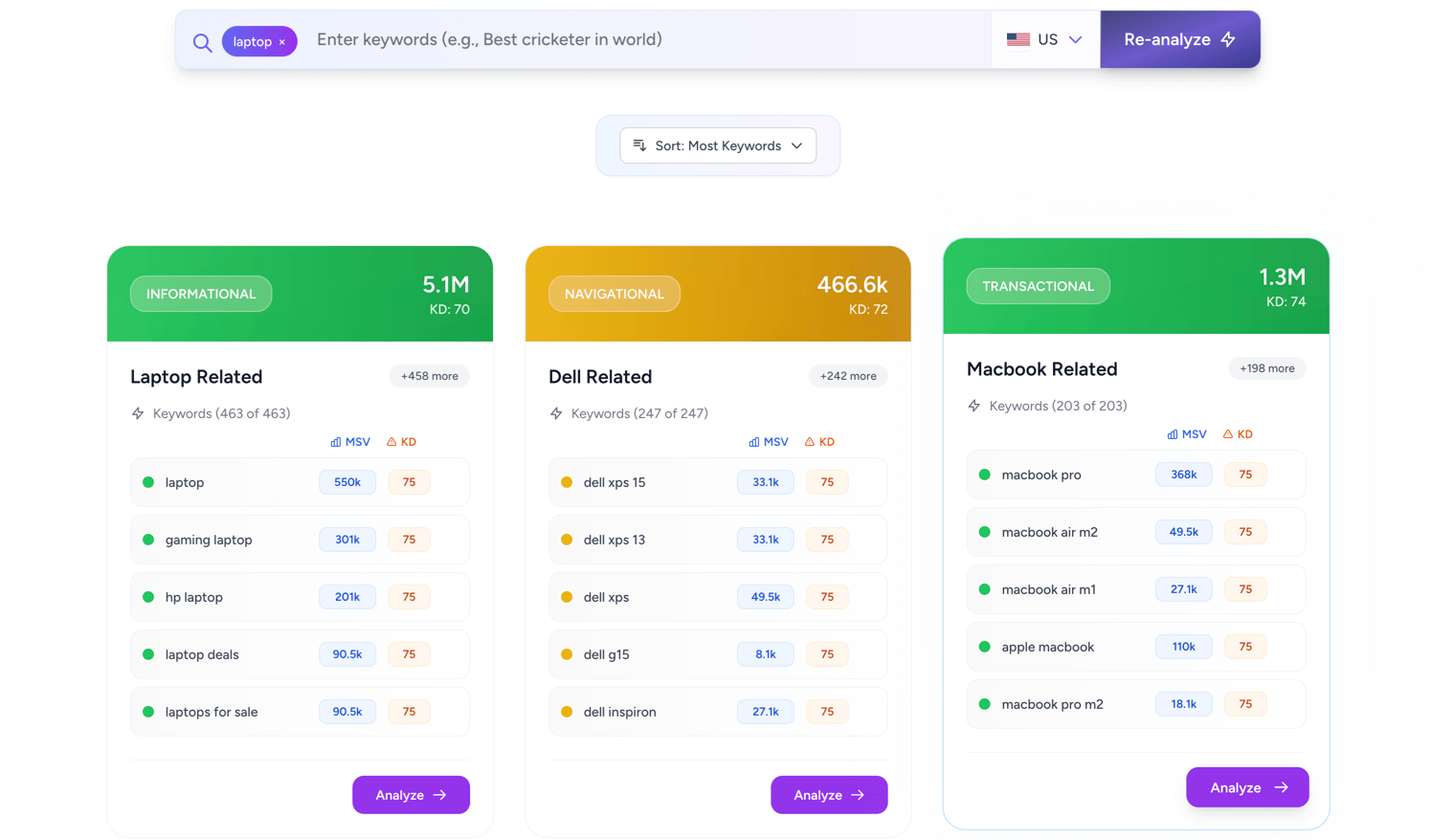 Smart Clustering: Our AI instantly groups related keywords into distinct, intent-based clusters (e.g., Informational, Navigational, Transactional). This gives you a clear overview of the content landscape. You can select an entire cluster to begin your deep dive.