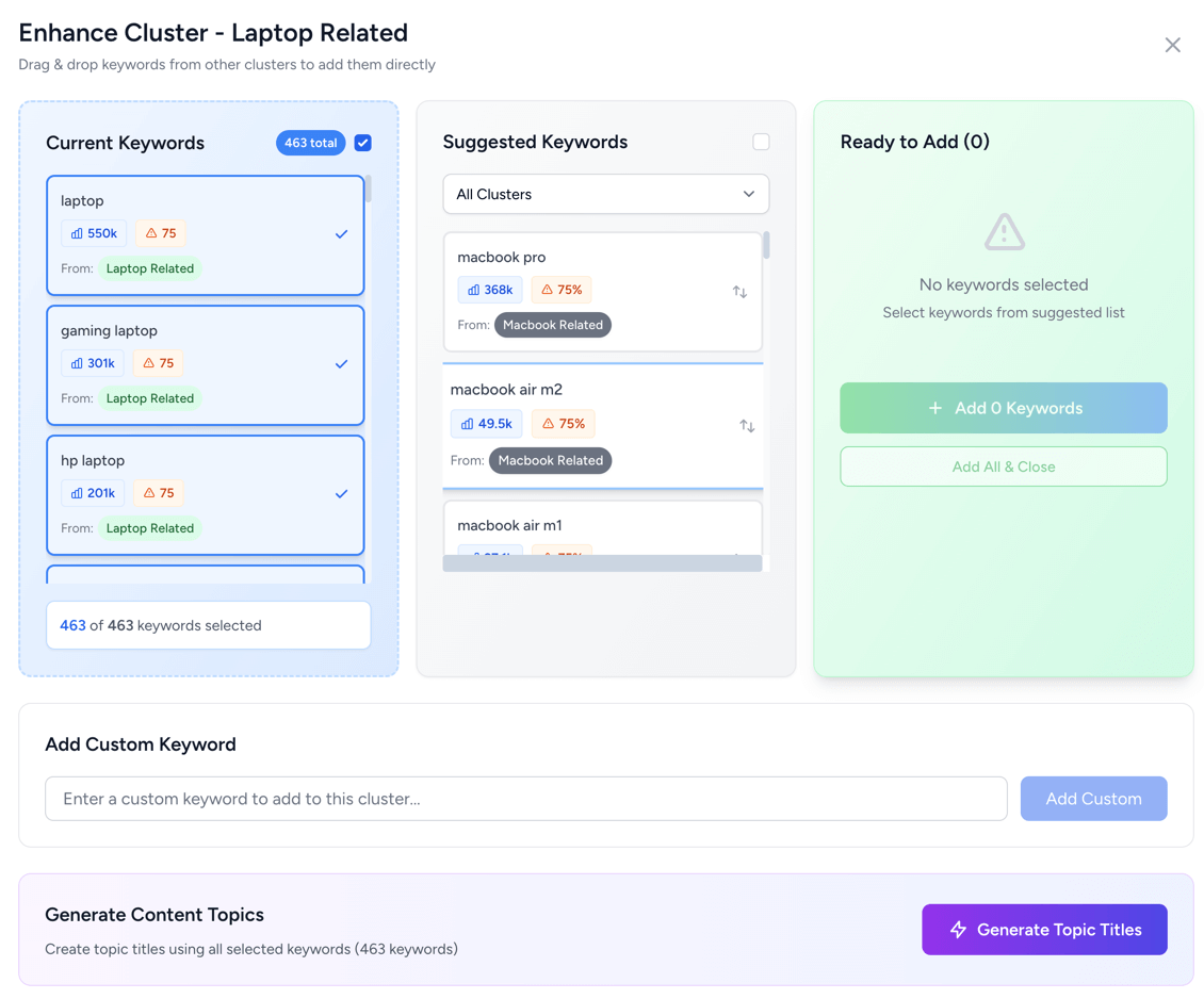 Expand Your Reach: Drag and drop suggested keywords from other clusters to enrich your topic.