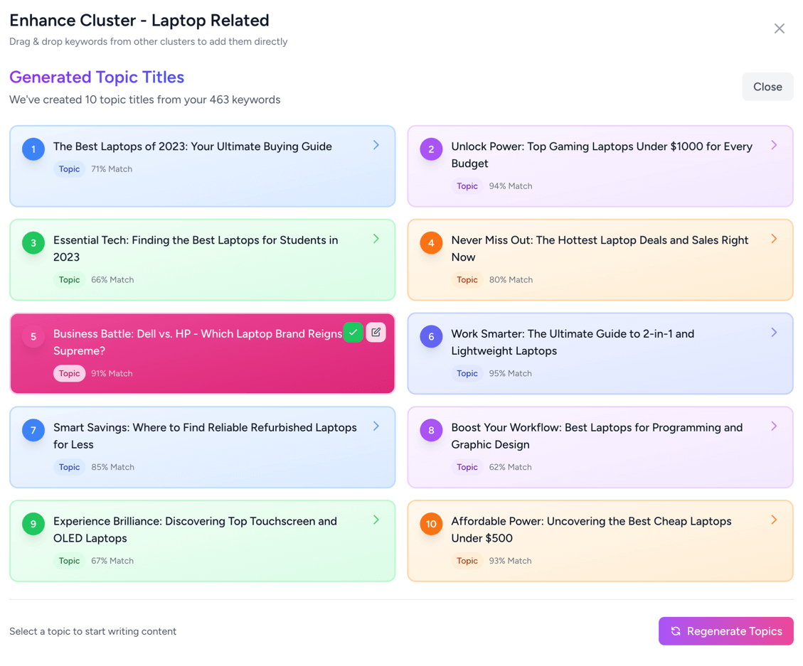 Select or Refine: Browse the generated titles, each with a match percentage to your keywords. You can select the best fit or edit any topic title to perfectly align with your vision.