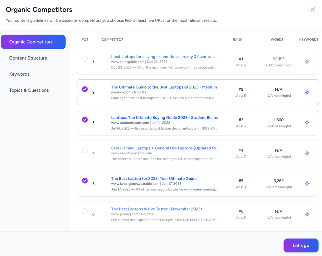 Competitor Analysis: Before writing a word, our tool analyzes the top-ranking organic competitors for your chosen topic.