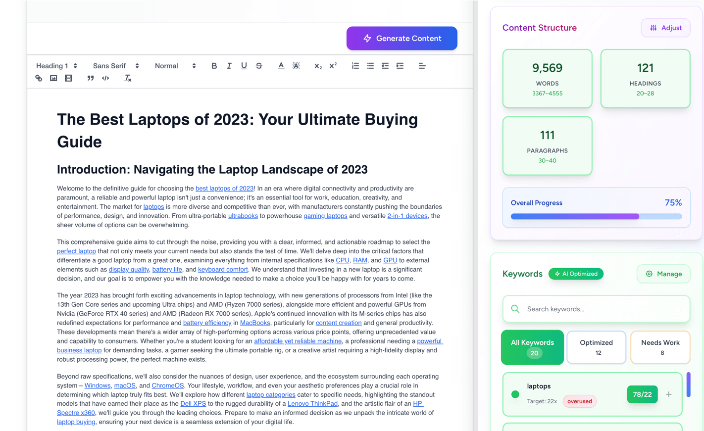 Live Optimization Sidebar: As you review and edit the content, a sidebar provides real-time SEO optimization scores. It flags keywords that are oversaturated or need more coverage, guiding you to the perfect density for every phrase.